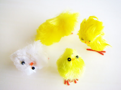 With Easter over I don't suppose it matters that these little chicks and rabbit are so damaged. Some missing eyes, others limbs and the rest irretrievably contorted or just plain squashed. That's what happens when my little nephew takes his basket of chicks to bed to snuggle and they end up wrapped up in the sheets and crushed beneath his restless little body. They're still cute though.