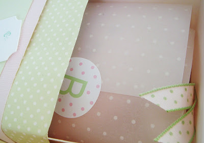 Mama created these intricately adorable invitations. A slide box was covered with layers of paper (polka dot and plain) wrapped in ribbon and topped w/ hand cut tags. Can you see the smiling baby beneath the polka dot vellum blaket? I unwrapped her to reveal a beribboned invitation and a rattle in the shape of a baby.