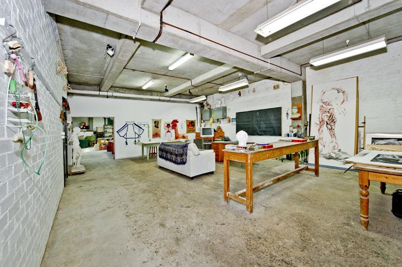 To walk through such an inspiring space with such incredible potential was a real privilege. We enter through a roller door into a 6 car space holding a kiln, and benches and shelves of ceramics. The next huge room houses large tables covered in enormous sheets of paper with half drawn artworks of amazing intricacy and the very front room holds true to the workshop it was with the 'waiting room' couches and 'office' etched on glass fronted door and a toilet for customers off to the side.