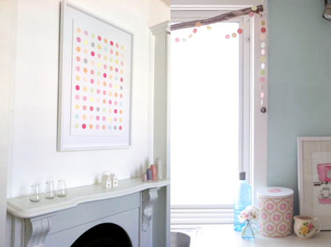 I love it when people send me pics of where they put C&H purchases once it finds its way into their homes.  Remember these dots - they found a home in a little girl's room. Squeak & Squirel, maker of beautiful childrens clothing hung a garland in her kitchen and had moved her little heart around her house. I agree, I love it on that mantle too - what a beautiful image. Thank you so much for sending these through.